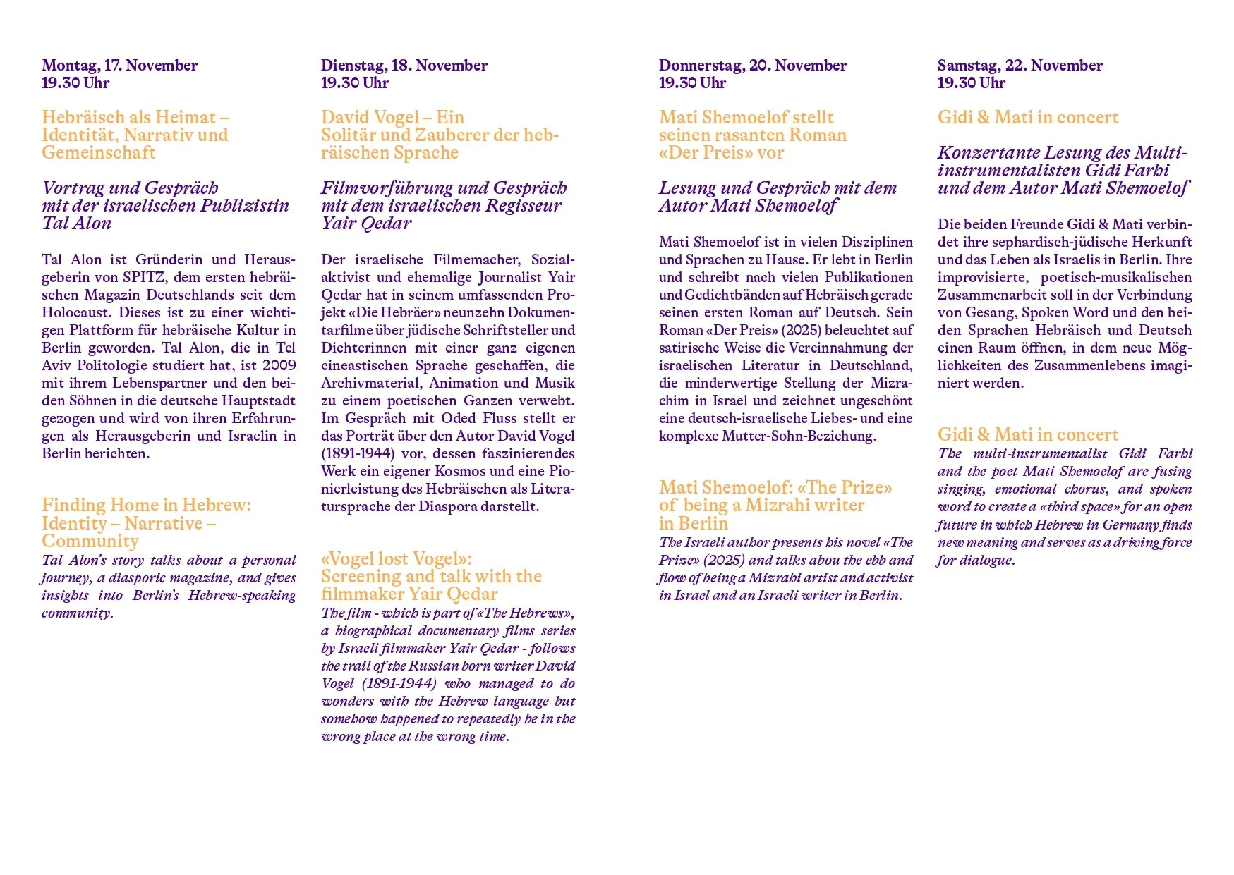 Mati Shemoelof ist in vielen Disziplinen und Sprachen zu Hause. Er lebt in Berlin und schreibt nach vielen Publikationen und Gedichtbänden auf Hebräisch gerade seinen ersten Roman auf Deutsch. Sein Roman «Der Preis» (2025) beleuchtet auf satirische Weise die Vereinnahmung der israelischen Literatur in Deutschland, die minderwertige Stellung der Mizrachim in Israel und zeichnet ungeschönt eine deutsch-israelische Liebes- und eine komplexe Mutter-Sohn-Beziehung.
